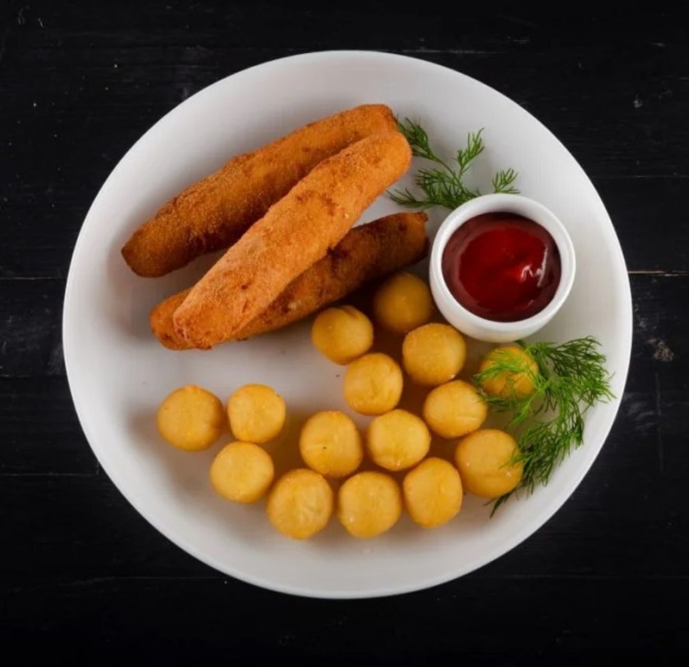 Куриные палочки с сыром моцарелла, картофель, кетчуп
