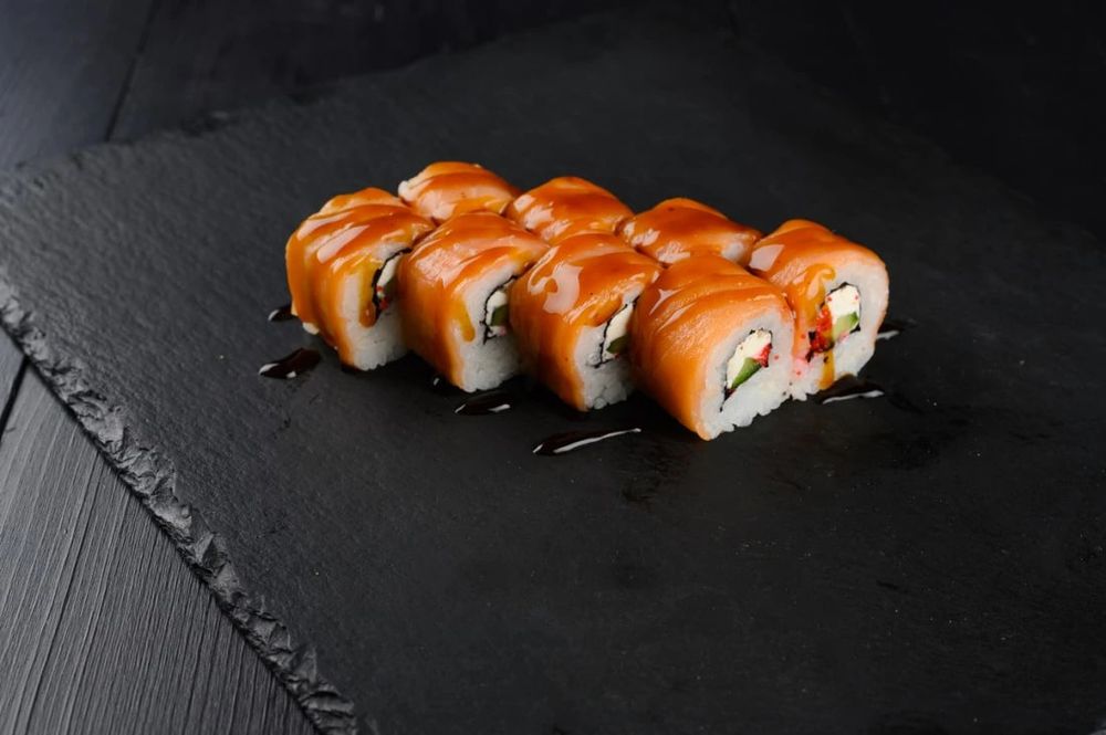Копченый лосось, икра тобико, огурец, творожный сыр, соус унаги