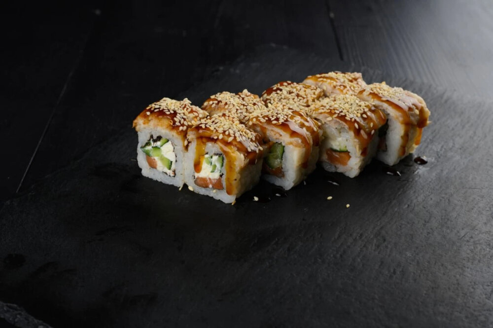 Копченый угорь, копченый лосось, творожный сыр, огурец, соус унаги