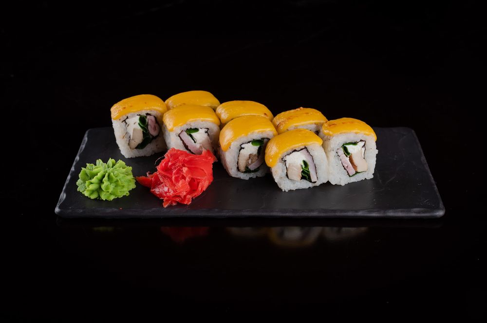 Рис, нори, творожный сыр, бекон, лук, курица, сыр чеддер