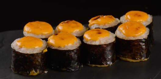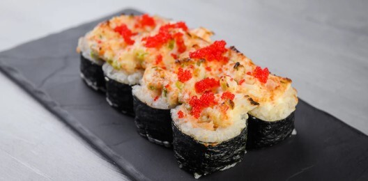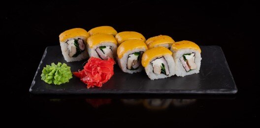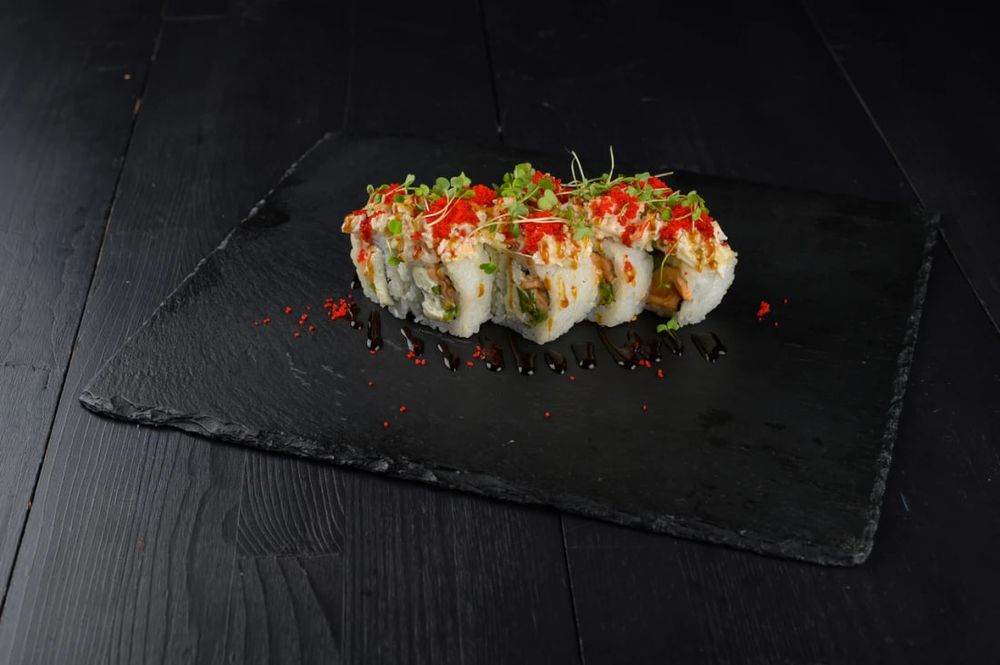 Сыр творожный, лосось с/м, авокадо, снежный краб, пармезан, икра тобико, соус унаги, микрозелень
