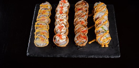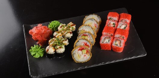 Ролл «Окинава», ролл «Филадельфия гриль», ролл «Санрайз», ролл «Хаяо», ролл «Сакура», ролл «Сырный лосось», ролл «Греческий» + в подарок кола 1 л
