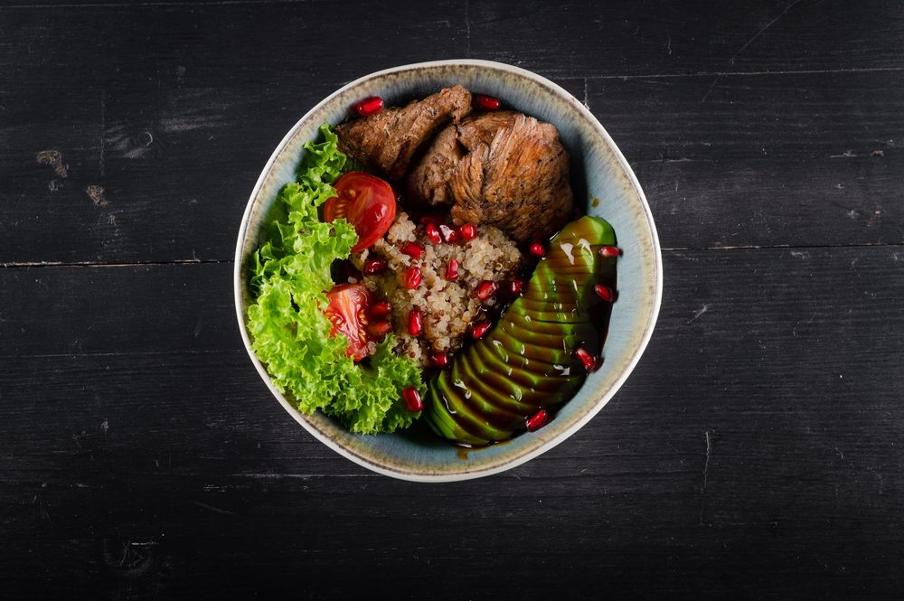 Авокадо, киноа, индейка, томаты черри, лист салата, гранат, соус унаги