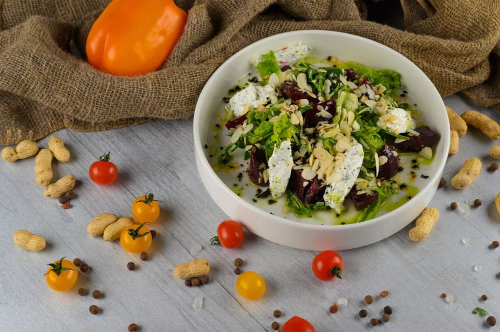 Свекла отварная, салатный микс, сыр творожный, миндальные лепестки, соус лимон-мята