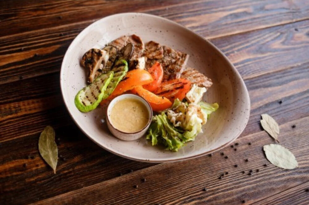 Говяжья вырезка, индейка, куриное филе с цукини, баклажаны, томаты, сладкий перец с соусом из дижонской зерновой горчицы