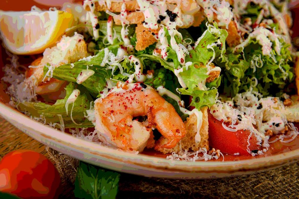 Микс салата, томаты, орех кедровый, орех кешью, гренки, соус цезарь, сыр пармезан