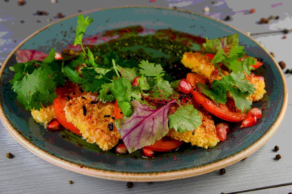 Сыр сулугуни, кукурузные хлопья, томаты, соус песто, соус ткемали, гранат