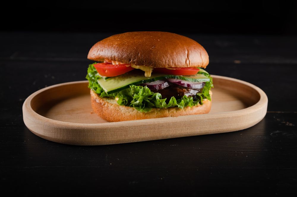 Булочка, говяжий бифштекс, томаты, огурцы, лук, салат, фирменный соус