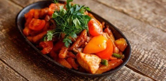Филе индейки, масло сливочное, кабачок, перец болгарский, лук, картофель, соус песто