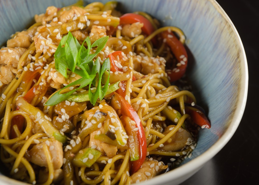 Яичная лапша с курицей терияки
