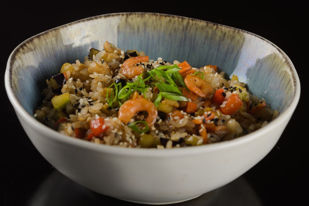 Морской коктейль, рис, баклажан, морковь, кабачки, болгарский перец, соевый соус, кунжут, зелень