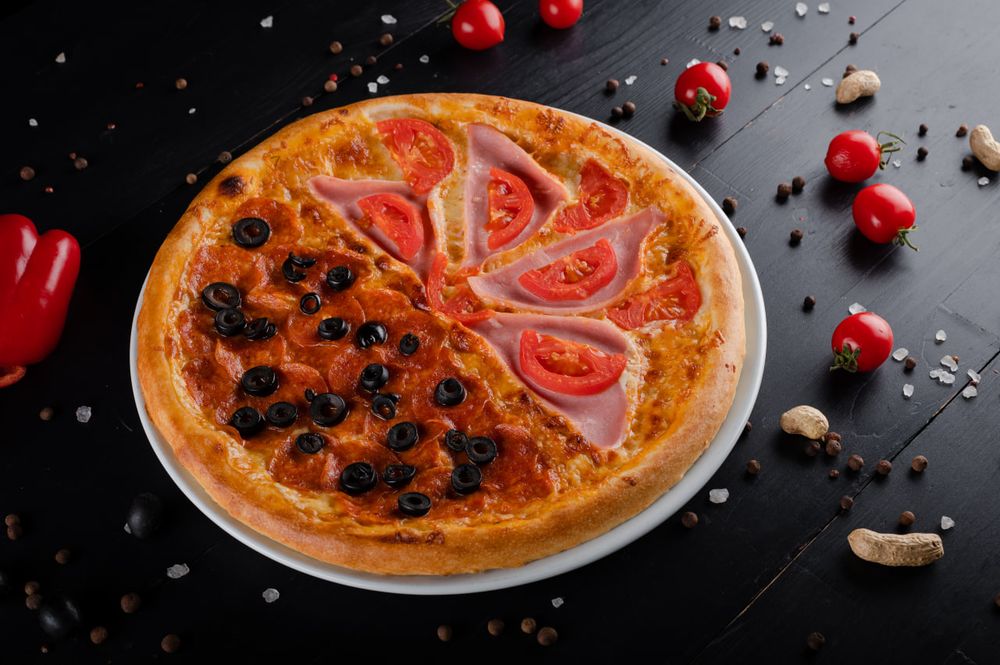 Ветчина, пеперони, белый соус, томаты, маслины, Гауда и Моцарелла