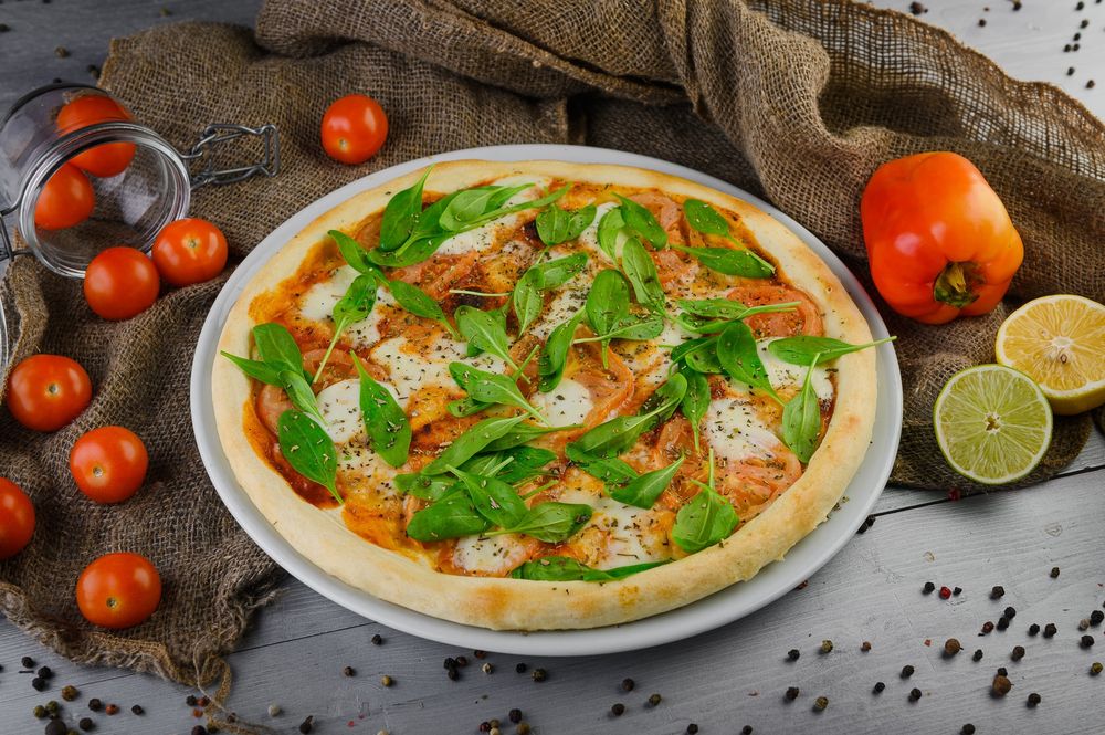 Сыр моцарелла живая, сыр моцарелла и гауда, томаты, соус красный, шпинат