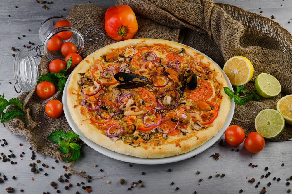 Мидии, креветки, кальмары, томаты, шампиньоны, перец болгарский, сыр гауда, моцарелла, соус красный