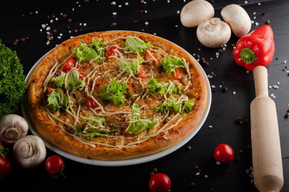 Куриное филе, томаты, микс салата, кедровые орешки, сыры гауда, моцарелла, соус цезарь, соус красный