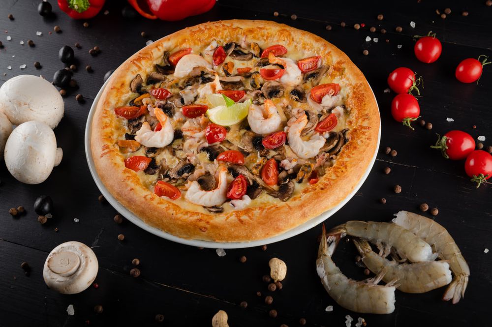 Морской коктейль, креветки тигровые, соус том ям, томаты, смесь сыров