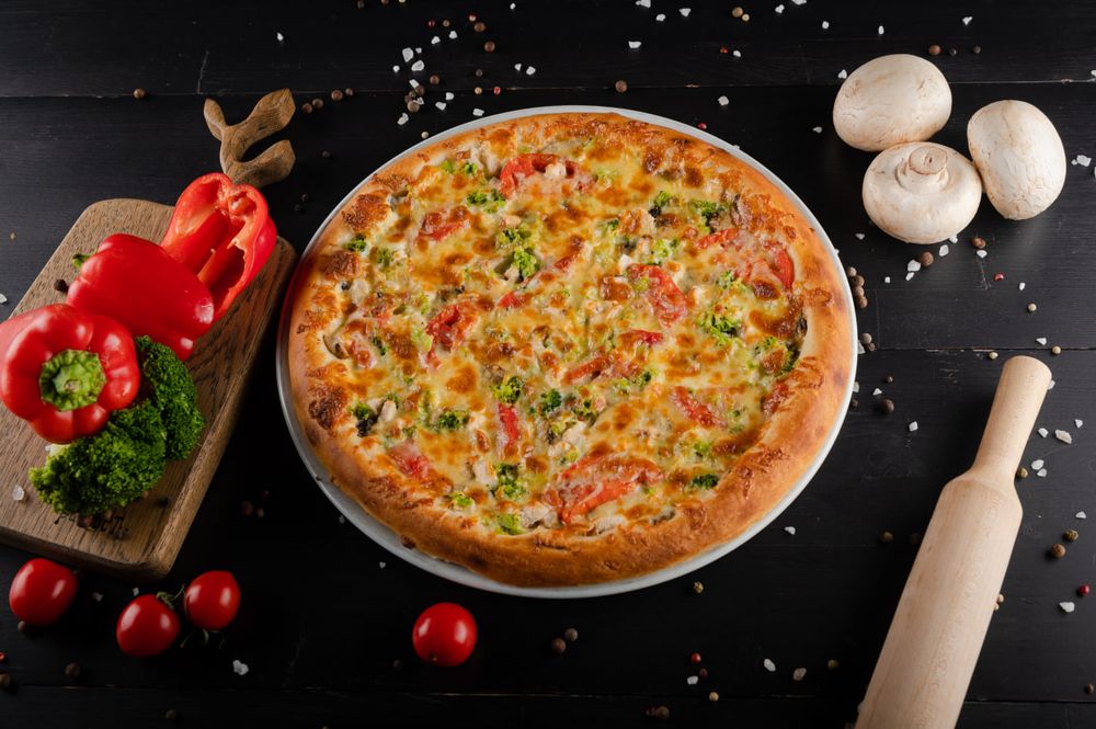 Куриное филе, брокколи, шампиньоны, томаты, мыр моцарелла и гауда, белый соус