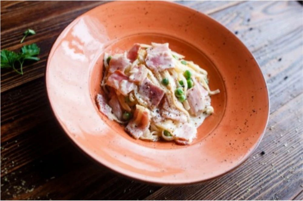 Бекон, сливки, сыр пармезан, зеленый горошек, лук