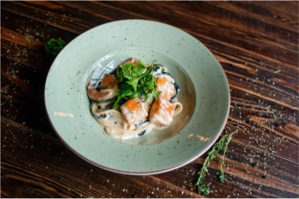 Сёмга, тигровые креветки, икра лосося, сливочный соус, сыр пармезан