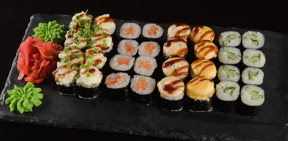 Ролл с огурцом, ролл с копченым лососем, ролл «Майами», ролл «Нагато»