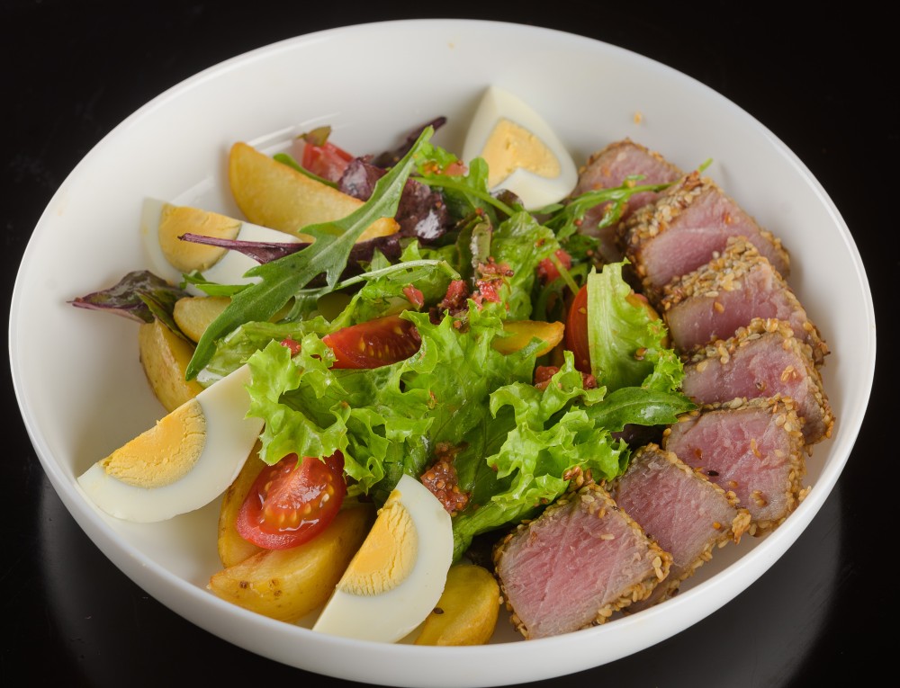 Тунец маринованный, салатный микс, имбирная заправка, картофель, томаты, яйца, кунжут