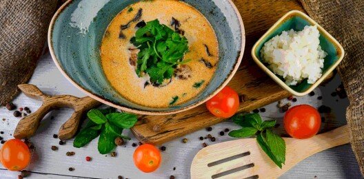 Курица, шампиньоны, сливки, имбирь, рис, томаты черри