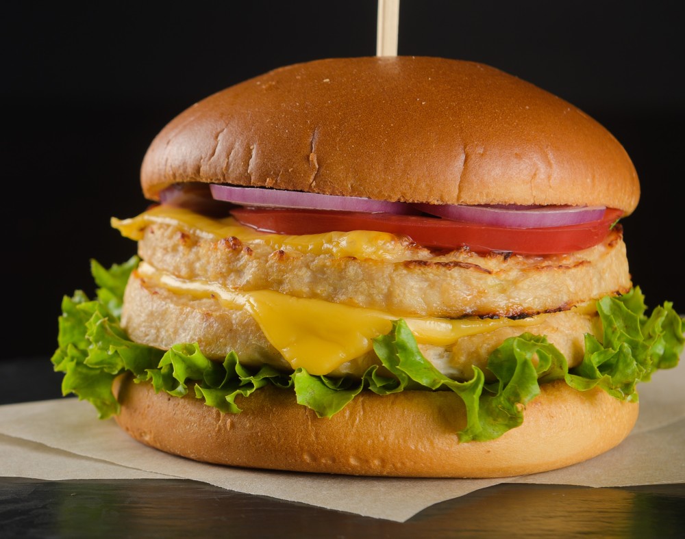 Булочка, лист салата, 2 куриных котлеты, сыр, томаты, огурцы, лук, терияки