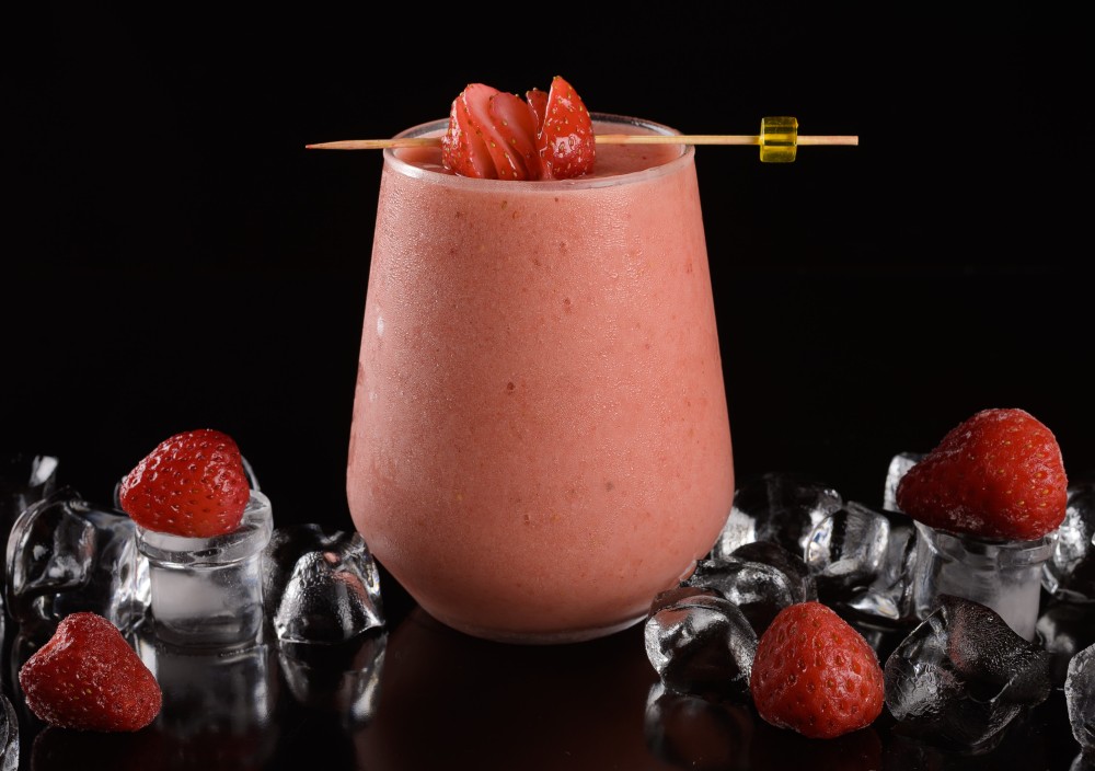 Клубника и банан, сок персика и несколько видов сиропа, лёд