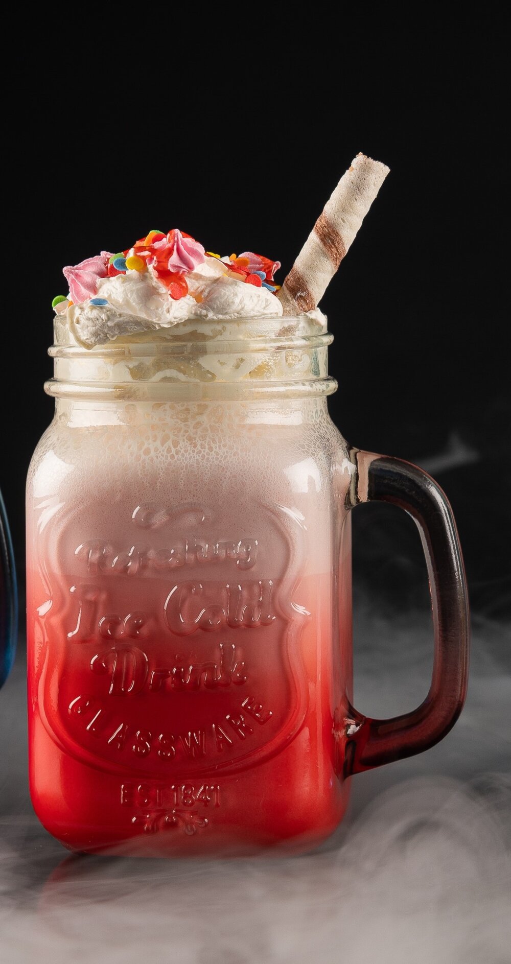 Клубнично-банановый коктейль с мороженым и взбитыми сливками
